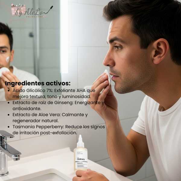 El Ácido Glicólico al 7% actúa como un alfa hidroxiácido (AHA) que exfolia la superficie de la piel para revelar una textura más suave, un tono más parejo y una apariencia visiblemente más saludable.